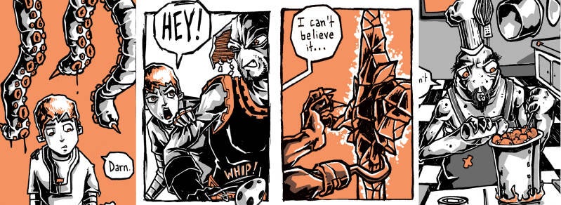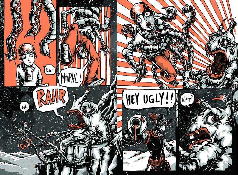 Adam Wreck is an all ages pulpy adventure sci-fi in the vein of Calvin and Hobbes and The Hitchhikers Guide To The Galaxy. After his parents, Albert and Betty Wreck, are taken captive by the dastardly Kalosian space pirates, Adam narrowly escapes only to be shipwrecked and stranded on an alien world. While marooned, Adam tangles with the local wildlife, discovers a priceless intergalactic treasure, and meets Captain Voric, a not-so-trustworthy rogue who may be Adam’s only ticket to get off world and save his family before they become dinner for blood thirsty pirates.